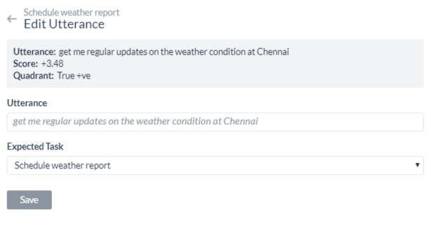 The higher the utterance in the True quadrants the better it exhibits expected behavior. True +ve represents a strong match with the task for which they are trained and the True -ve represents a mismatch with the irrelevant intents as expected. Utterances at a moderate level in the True quadrants can be further trained for better scores.