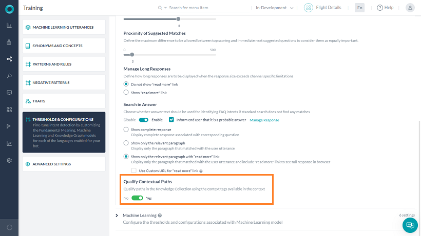 The platform consumes the output context tags and uses them for improving intent detection in the Knowledge Graph engine based on the flag set by the developer. This flag ensures that the context tags are used to qualify paths in Knowledge Graph. Context tags are used to extract terms and these terms are clubbed with any other terms present in user utterance. The consolidated list of terms is used for qualifying the path.