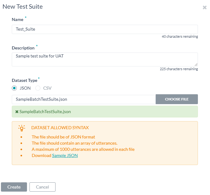 新しいテストスイートを使用することで、バッチファイル(データセットとも呼ばれる)に、テスト発話の配列を一度にまとめてインポートできます。データセットファイルはCSVまたはJSON形式で記述する必要があり、最大10,000の発話を含めることができます。新しいテストスイートオプションを使用して、テストスイート作成の一部としてサンプルのCSVまたはJSONファイル形式をダウンロードできます。