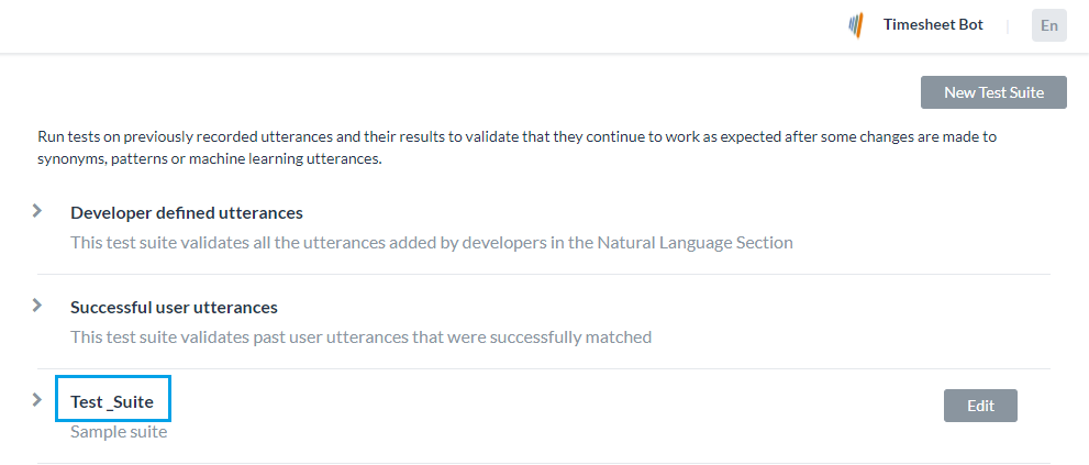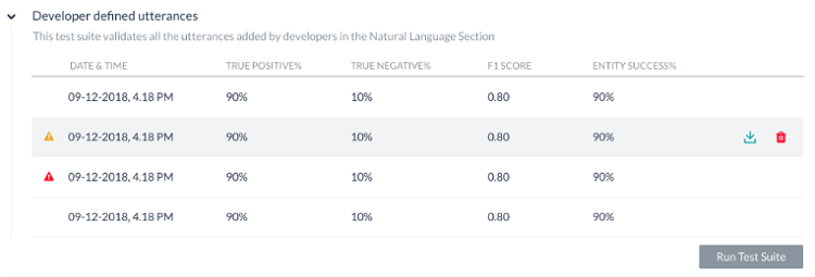 このテストスイートは、機械学習の発話画面から、開発者が以前に追加およびトレーニングした発話を検証します。このテストスイートを使用するということは、開発者がBotのすべてのタスクに対して追加した発話セット全体をまとめてテストすることを意味します。