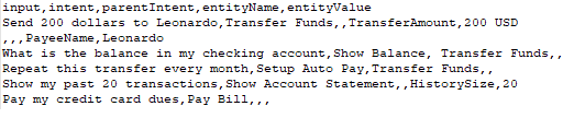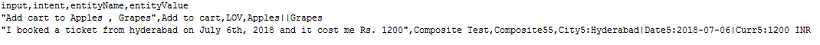 カスタムスイートを作成するためのCSV形式では、テストケースをCSVファイルのレコードとして定義することができます。各テストケースは、テスト対象の発話、テスト対象の発話に対するインテントから構成され、オプションで発話から決定するエンティティを定義します。テストケースで文から複数のエンティティを検出する必要がある場合は、検出される追加のエンティティごとに追加の行を含める必要があります。期待されるインテントが子のインテントである場合は、検討される親のインテントを含めることもできます。
